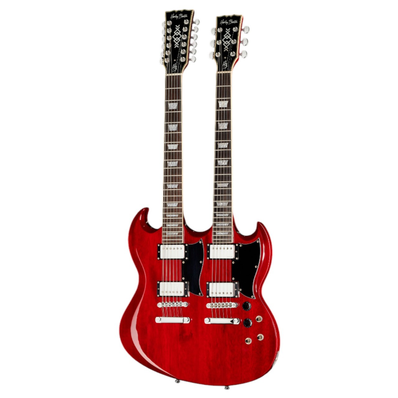 Harley Benton DC-Custom II 612 Cherry - электрогитара с двойным грифом для максимальных творческих возможностей. Один гриф имеет 12 струн для богатого гармоничного звучания, другой - 6 струн для классической игры. Корпус из махагони с покрытием Cherry обеспечивает теплый, насыщенный тон. Мощные хамбакеры подходят для разных жанров - от чистого звука до перегруза. Удобный дизайн позволяет комфортно играть на обоих грифах. Идеальный выбор для инновационных музыкантов!